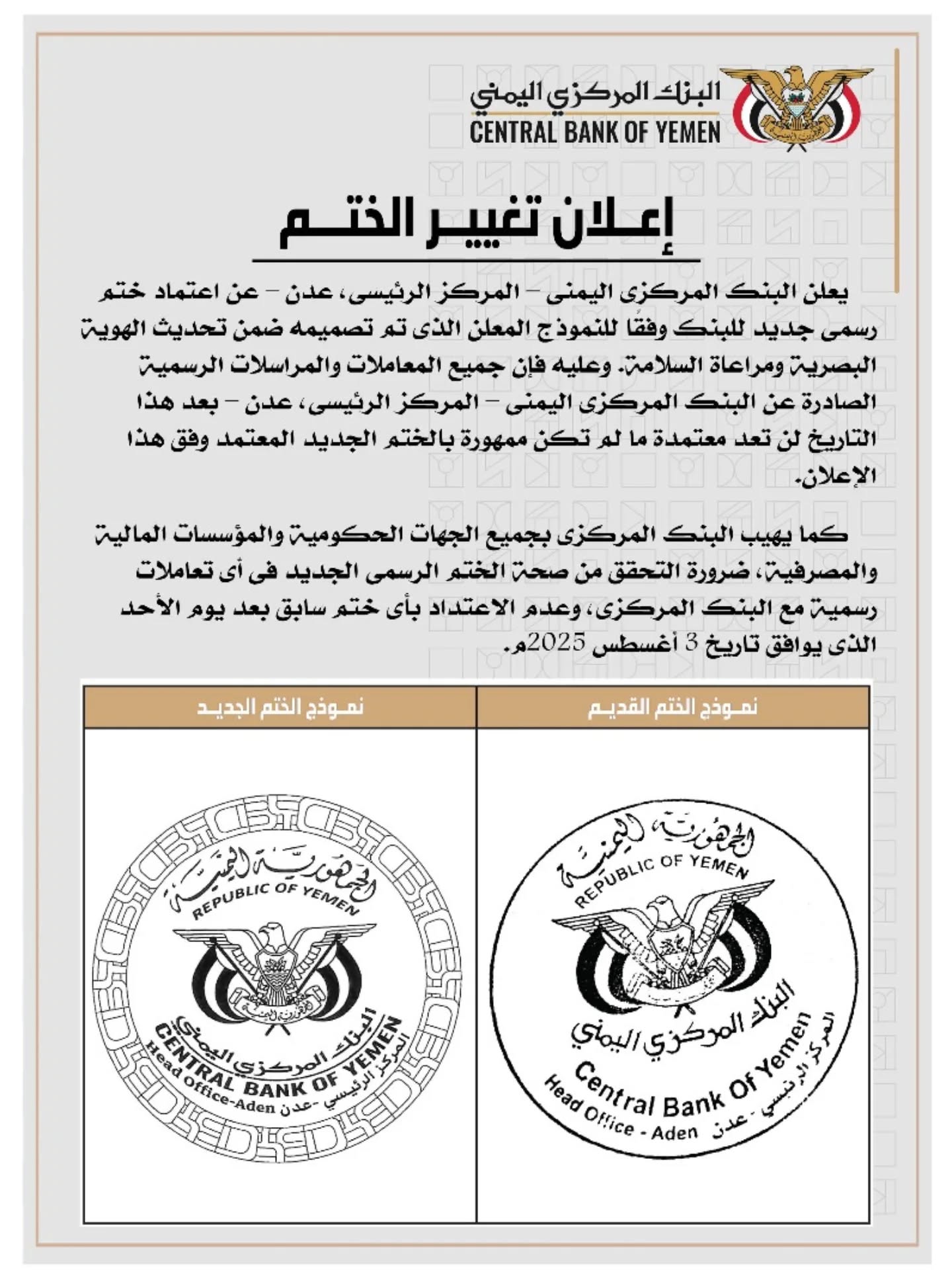 ودعا البنك المركزي، جميع الجهات الحكومية والمؤسسات المالية والمصرفية، لضرورة التحقق من صحة الختم الرسمي الجديد في أي تعاملات رسمية مع البنك المركزي، وعدم الاعتداد بأي ختم سابق بعد يوم الأحد الذي يوافق تاريخ 3 أغسطس 2025م.