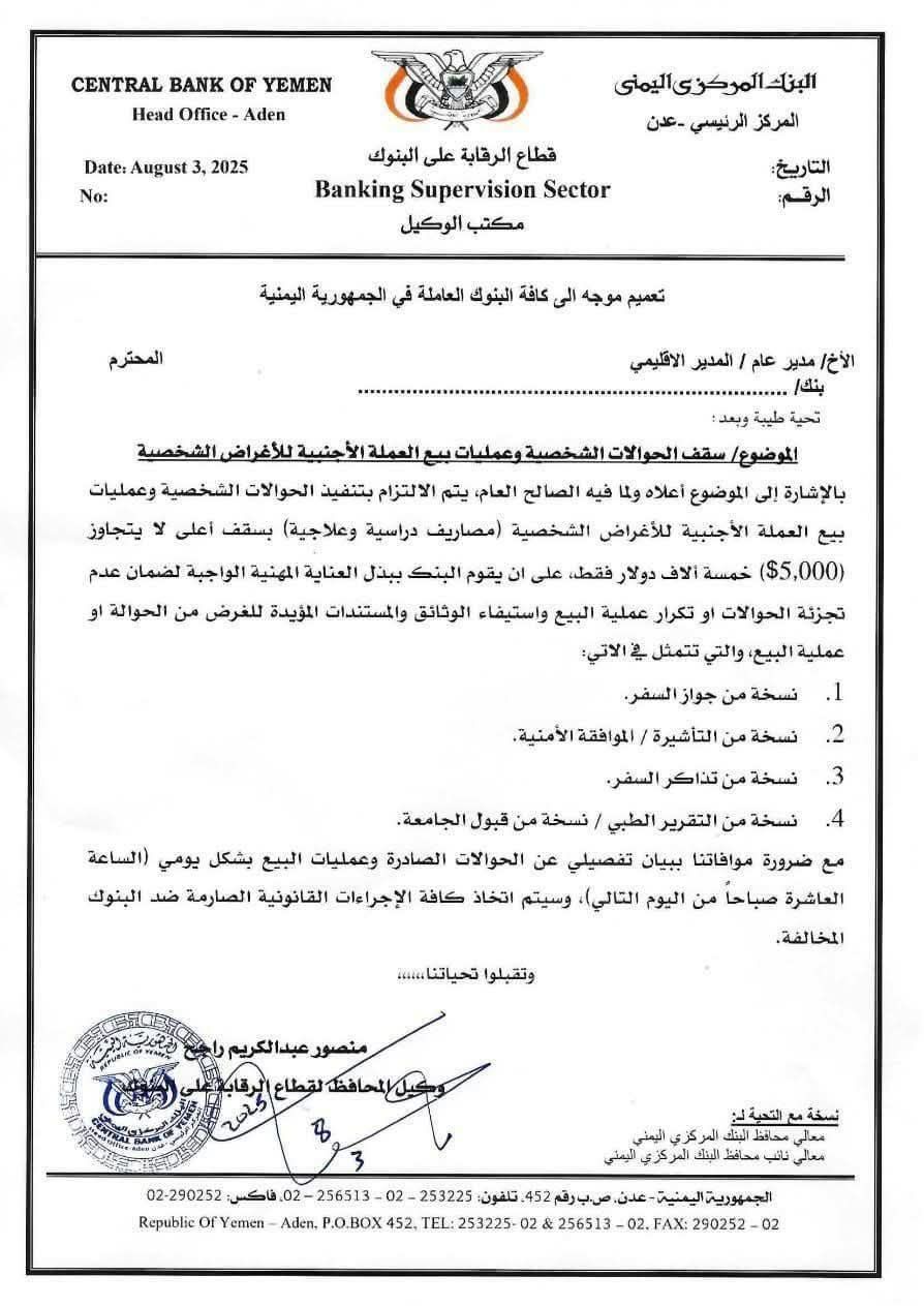 وأصدر البنك المركزي تعميما جديدا حدد فيه سقفًا للحوالات وعمليات الصرف الشخصية لا يتجاوز 5 آلاف دولار، مع إلزام البنوك باستيفاء الوثائق المؤيدة للغرض من الحوالة أو عملية المصارفة.
