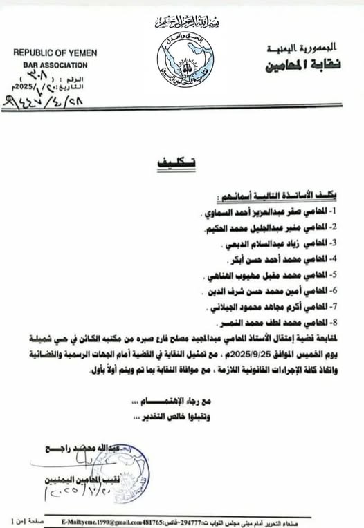 جاء ذلك في قرار تكليف أصدرته نقابة المحامين اليمنيين، لمتابعة قضية اختطاف عضو النقابة المحامي "صبرة".