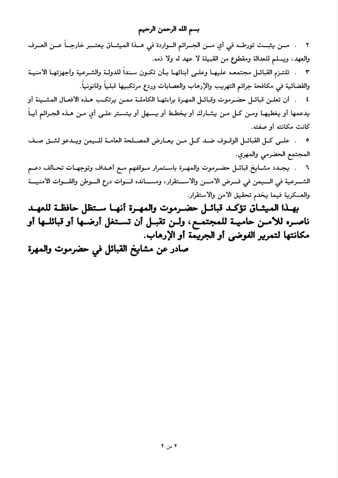 5. على كل القبائل الوقوف ضد كل من يعارض المصلحة العامة لليمن ويدعو لشق صف المجتمع الحضرمي والمهري.