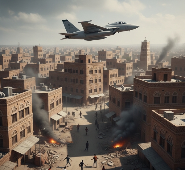 [ تقرير سام رصد العديد من الغارات وحللها - صورة بالذكاء الاصطناعي ]