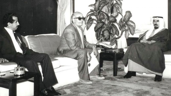 [ جباري في لقائه مع أمير الكويت الراحل جابر الأحمد الصباح وإلى جانبه أحمد زيد الرضي سفير اليمن لدى الكويت/ بي بي سي ]