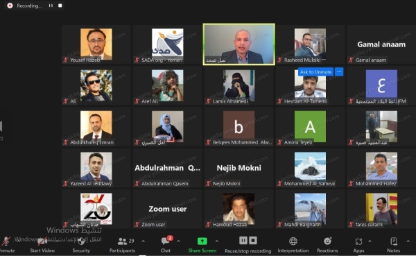 عقدت المنظمة الوطنية للإعلاميين اليمنيين "صدى"، ورشة عمل نقاشية عبر الإنترنت، شارك فيها أكثر من 30 ممثلاً عن منظمات دولية ومحلية، إلى جانب مؤسسات إعلامية يمنية وصحفيين، لمناقشة الدراسة القانونية الصادرة مؤخراً عن المنظمة بعنوان: "حرية التعبير والصحافة في اليمن بين قصور التشريعات وعجز القضاء".