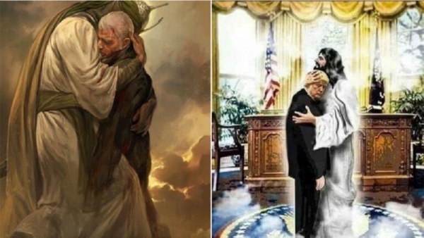 نشر نشطاء على مواقع التواصل الاجتماعي، صورا للمسيح يحتضن الرئيس دونالد ترامب، ردا على الصورة التي نشرها موقع إيراني، وتظهر احتضان الإمام الحسين لقاسم سليماني.
