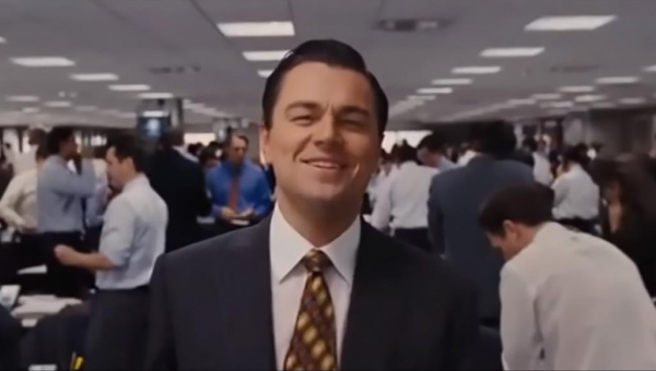 [ مشهد كسر الجدار الرابع الوهمي بفيلم "ذئب وول ستريت" (مواقع التواصل) ]