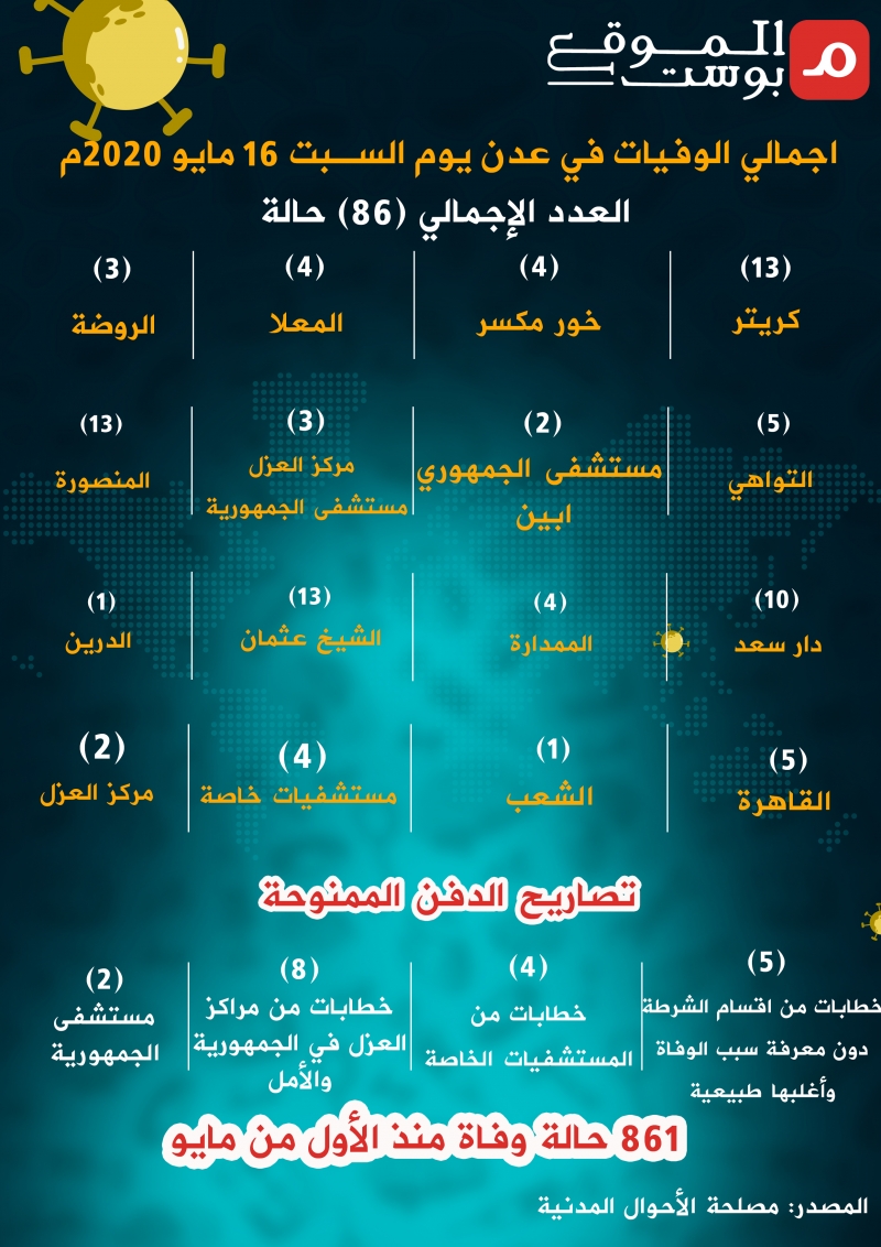 عدد الوفيات في عدن يوم السادس عشر من مايو بسبب الأوبئة