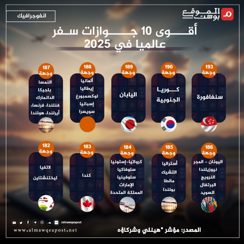 أقوى 10 جوازات سفر عالميا في 2025 وعدد الوجهات المسموح بها