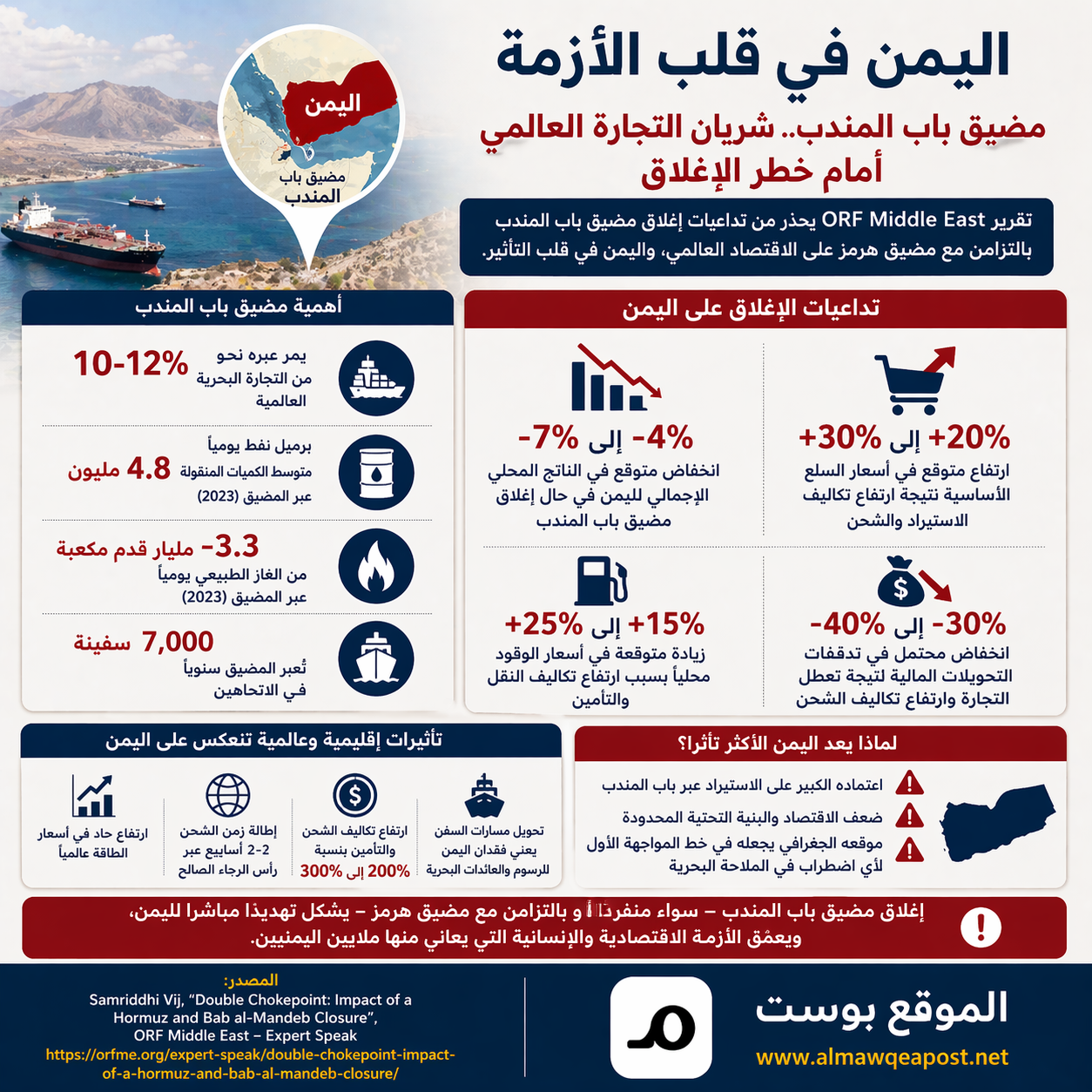 وبحسب تحليل نشره مركز ORF Middle East فإن وترجمه الموقع بوست فإن سيناريو الاختناق المزدوج في هذين المضيقين الاستراتيجيين قد يُحدث صدمة مزدوجة في أسواق الطاقة والتجارة العالمية، مع تأثيرات غير متكافئة على الدول الأكثر هشاشة، ومنها اليمن.