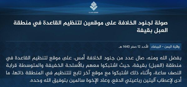 ونشر تنظيم "داعش" إفادة تناقلتها مواقع على شبكة الإنترنت بأن عددا من أعضائه اشتبكوا بالأسلحة الخفيفة والمتوسطة لنصف ساعة مع أفراد من تنظيم القاعدة في موقعين منفصلين بمنطقة العبل بقيفة.