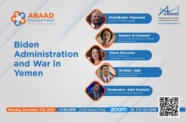 أعلن مركز أبعاد للدراسات والبحوث أنه سيدشن منتدى خاص يتتبع الحالة اليمنية حول إدارة الرئيس الأمريكي الجديد جو بايدن والحرب في اليمن بندوة افتراضية الاثنين المقبل الساعة الثامنة مساء بتوقيت اليمن.