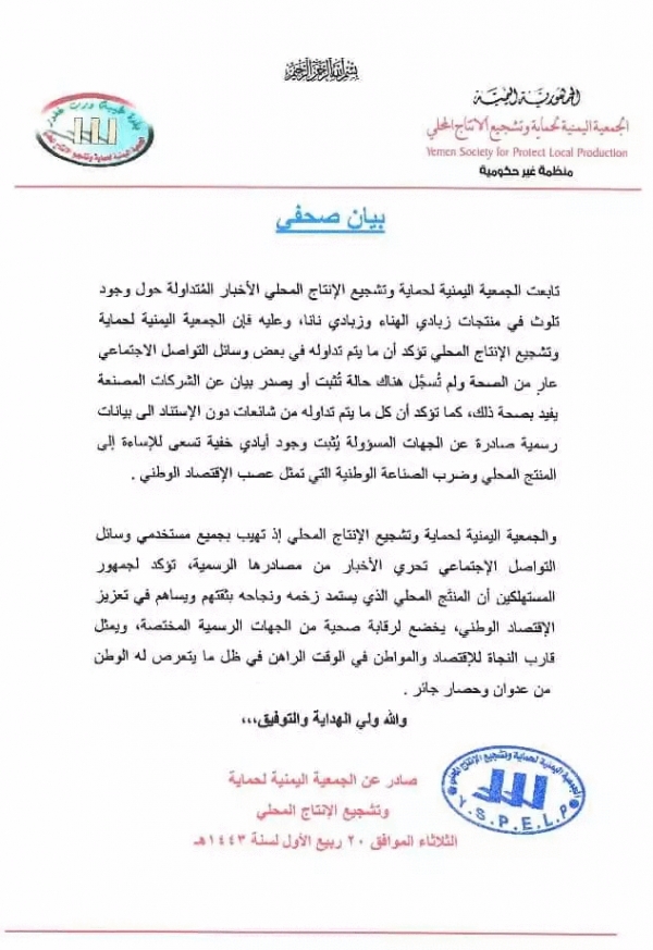 وقال أن نشر هذه الشائعات دون الاستناد إلى تقارير رسمية صادرة عن الجهات المسؤولة يثبت وجود أيادي خفية تعمل على ضرب الصناعة الوطنية والإساءة للمنتج المحلي الذي يمثل عصب الاقتصاد الوطني.