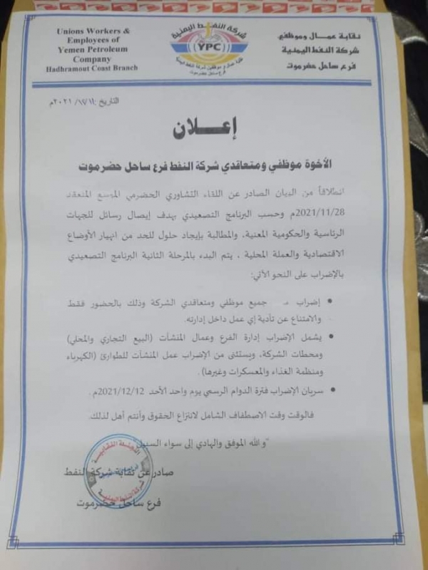 دعت نقابة عمال وموظفي شركة النفط اليمنية في ساحل حضرموت السبت، جميع منتسبيها إلى تنفيذ إضراب شامل مع الحضور دون العمل يوم غد الأحد، للمطالبة بإيجاد حلول للحد من انهيار الاوضاع الاقتصادية والعملة المحلية.