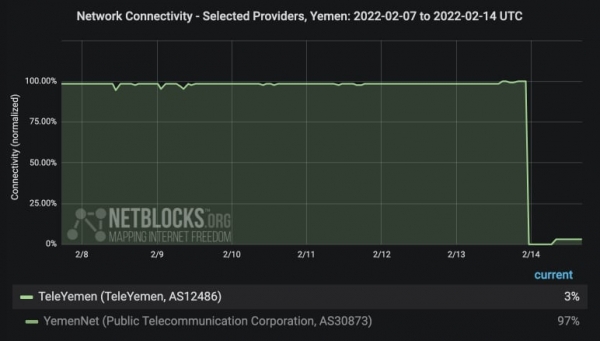 وقالت "نت بلوكس" في تغريدة لها على تويتر، إن انقطاع كبير للإنترنت في اليمن بعد سلسلة من الغارات الجوية الجديدة، بينما تظهر المقاييس في الوقت الفعلي انهيار الاتصال شركة "تيليمن" وسط تقارير عن هجوم يستهدف المقر الرئيسي لمزود الخدمة.