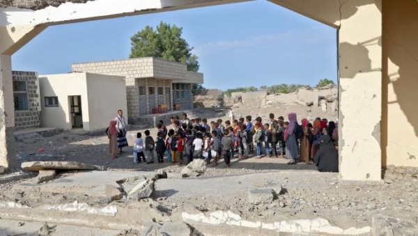 [ أطفال يمنيون يبدأون عامهم الدراسي في مدرسة طاولتها الحرب، بالحُديدة، أكتوبر 2022 (Getty) ]