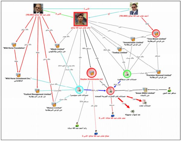 وكـان الفريـق قـد عـرض، في تقريـره النـهائي السـابق، أدلـة مسـتندية تشـير إلى أنـه في 23 تشـرين الأول/أكتـوبر 2014، نقلت جميـع الأسـهم الـتي يملكهـا علـي عبـد االله صـالح في شــركتي Limited Albula و Limited Weisen إلى خالــد علــي عبــد االله صــالح.